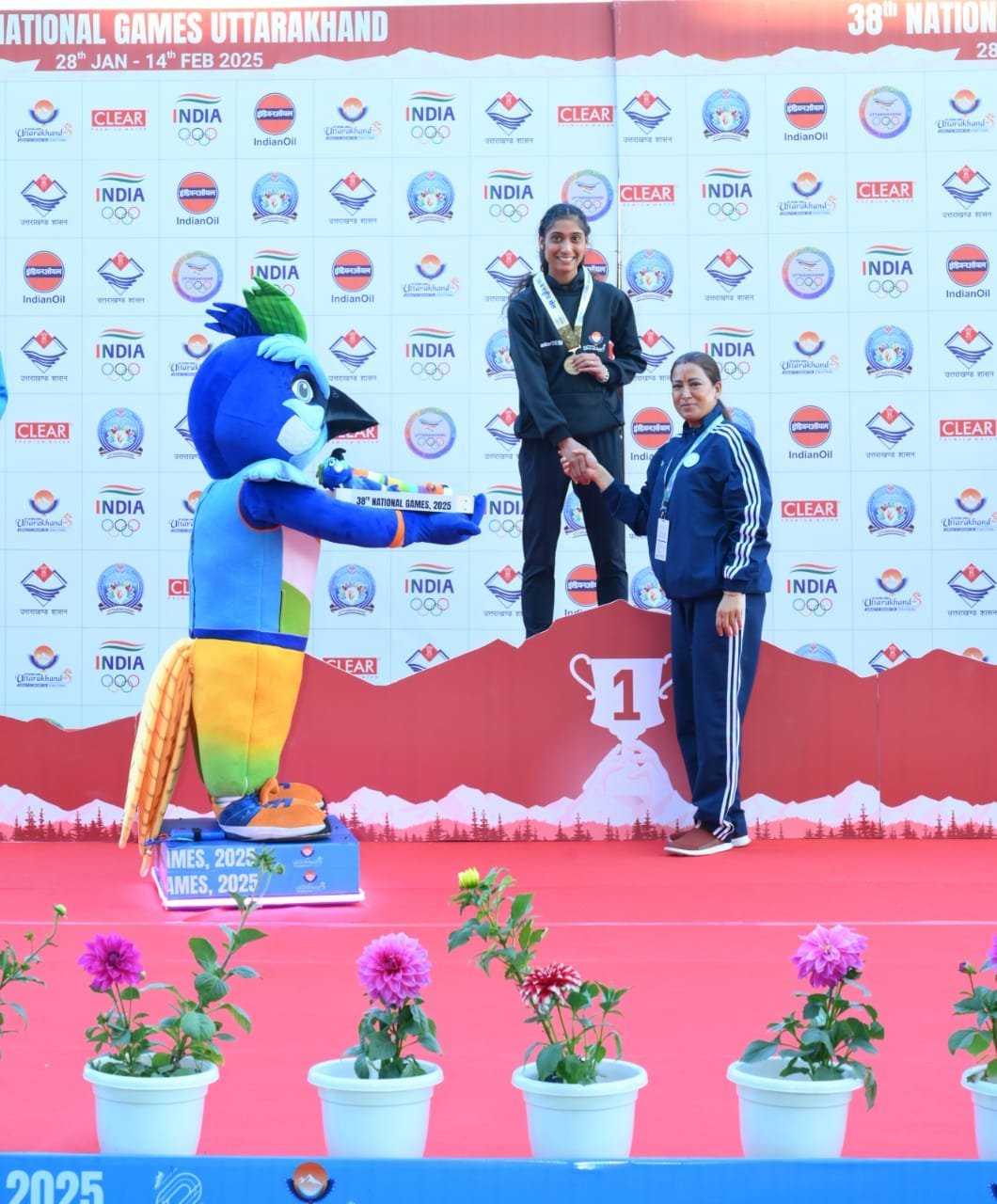 उत्तराखंड में आयोजित हो रहे 38वें नेशनल गेम्स में सोमवार दस फरवरी को एथलेटिक्स प्रतियोगिताएं हुई. तीन हजार मीटर की स्टीपलचेज दौड़ में उत्तराखंड की खिलाड़ी अंकिता ध्यानी ने गोल्ड मेडल जीता है. उत्तराखंड की खेल मंत्री रेखा आर्य ने खुद अंकिता ध्यानी को अपने हाथों से मेडल पहराया. इस मौके पर अंकिता ने कहा कि इस नेशनल गेम्स के लिए उन्होंने इंटरनेशनल मैच से ज्यादा मेहनत की थी. क्योंकि यह प्रदर्शन उनके अपने राज्य के लिए था।तीन हजार मीटर की स्टीपलचेज दौड़ को अंकिता ध्यानी ने 9:53.63 मिनट में पूरा किया। पहले नंबर पर जहां अंकिता ध्यानी रही तो वहीं दूसरे नंबर मध्य प्रदेश की मंजू यादव रही. मंजू यादव ने 10:15.70 मिनट में तीन हजार मीटर की स्टीपलचेज दौड़ को पूरा कर सिल्वर मेडल जीता. इन दोनों के अलावा उत्तर प्रदेश की रेबी पाल ने 10:37.15 मिनट ने इस रेस को पूरा कर ब्रॉन्च जीता।