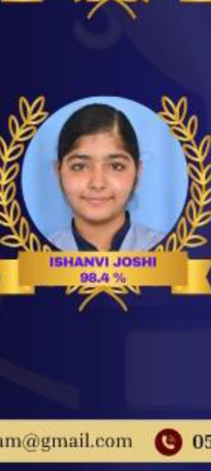 जे.के. पुरम (बी-ब्लॉक) हल्द्वानी की रहने वाली इशान्वी जोशी ने कुल 500 में से 492 अंक प्राप्त किए हैं। उनकी इस उपलब्धि से न केवल स्कूल बल्कि पूरे क्षेत्र का गौरव बढ़ा है। बता दें कि वह प्रसिद्ध ज्योतिषाचार्य डॉ. मंजू जोशी की सुपुत्री हैं।