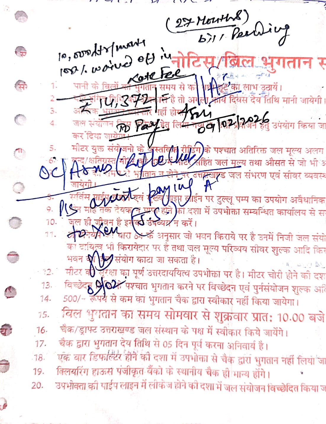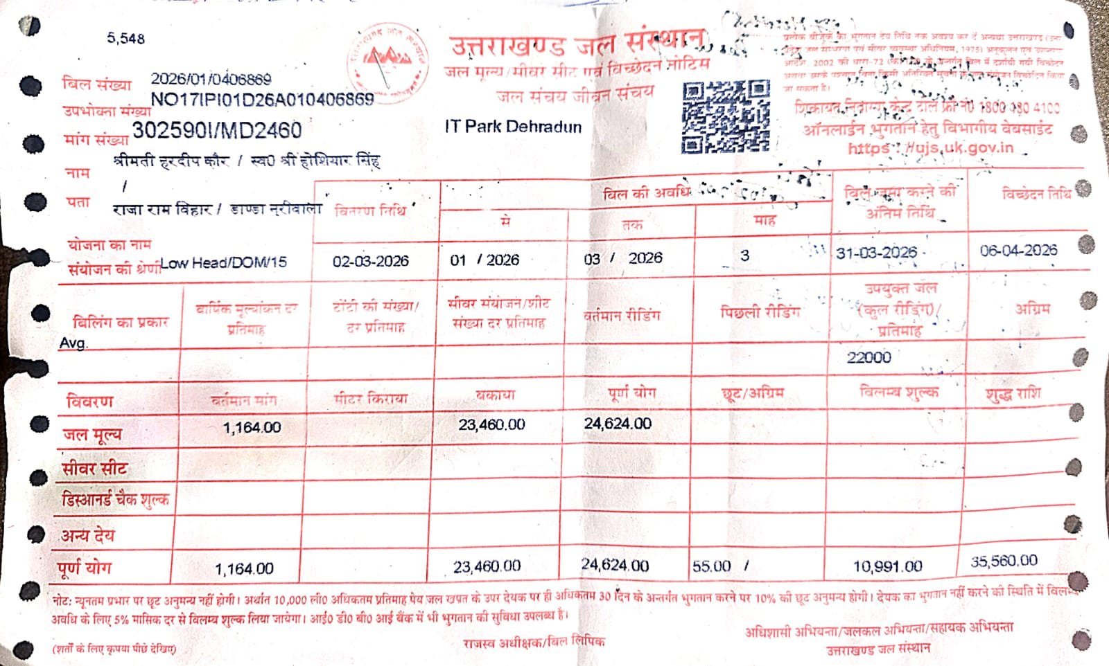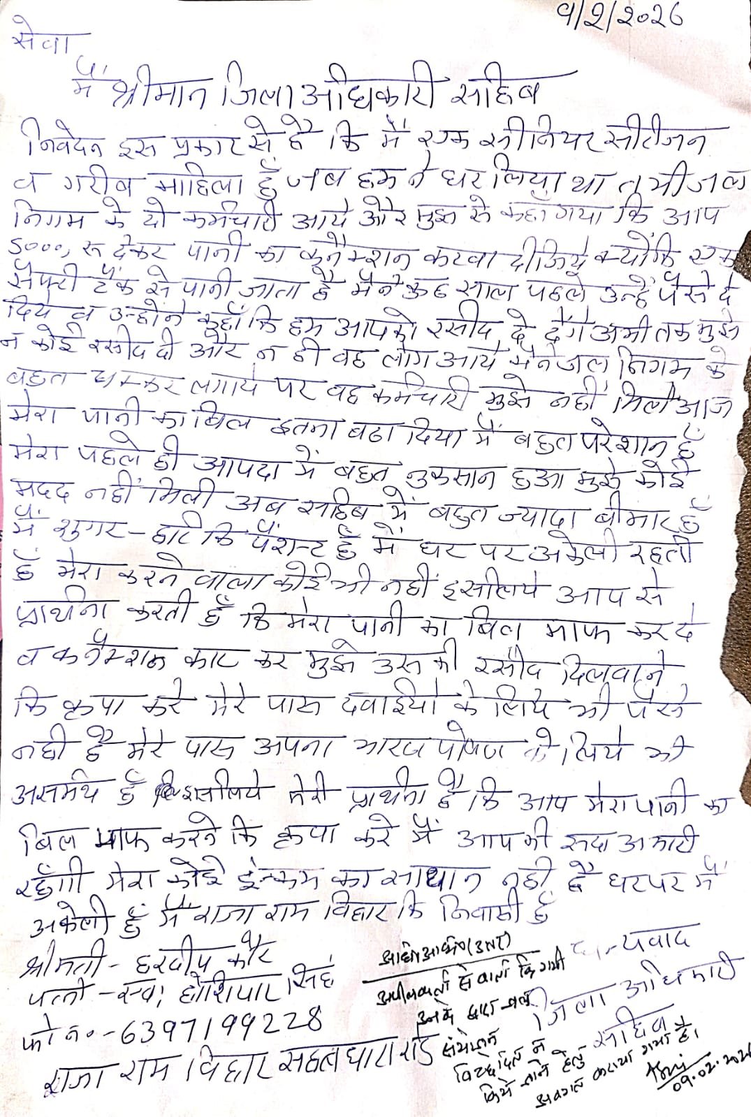 देहरादून दिनांक 10 फरवरी 2026 (सूवि) प्रत्येक सोमवार कलेक्टेªट सभागार में जिलाधिकारी सविन बंसल की अध्यक्षता में आयोजित होने वाले जनता दर्शन कार्यक्रम बड़ी संख्या में फरियादी अपनी शिकायतों के निस्तारण हेतु उपस्थित हो रहे हैं तथा फरियादियों की समस्याओं का त्वरित निस्तारण होने से सरकार तथा जिला प्रशासन की कार्यशैली पर जनमानस का भरोसा बढा है। विगत जनता दर्शन कार्यक्रम में सहस्त्रधारा निवासी बुजुर्ग महिला हरदीप कौर ने अपनी व्यथा सुनाते हुए जिलाधिकारी को बताया कि उनका पेयजल बिल 35,000 आ गया है, जिसे वह भरने में असमर्थ हैं। उन्होंने बताया कि वह घर में अकेली रहती हैं, आय का कोई स्थायी साधन नहीं है तथा अक्सर बीमार रहती हैं।