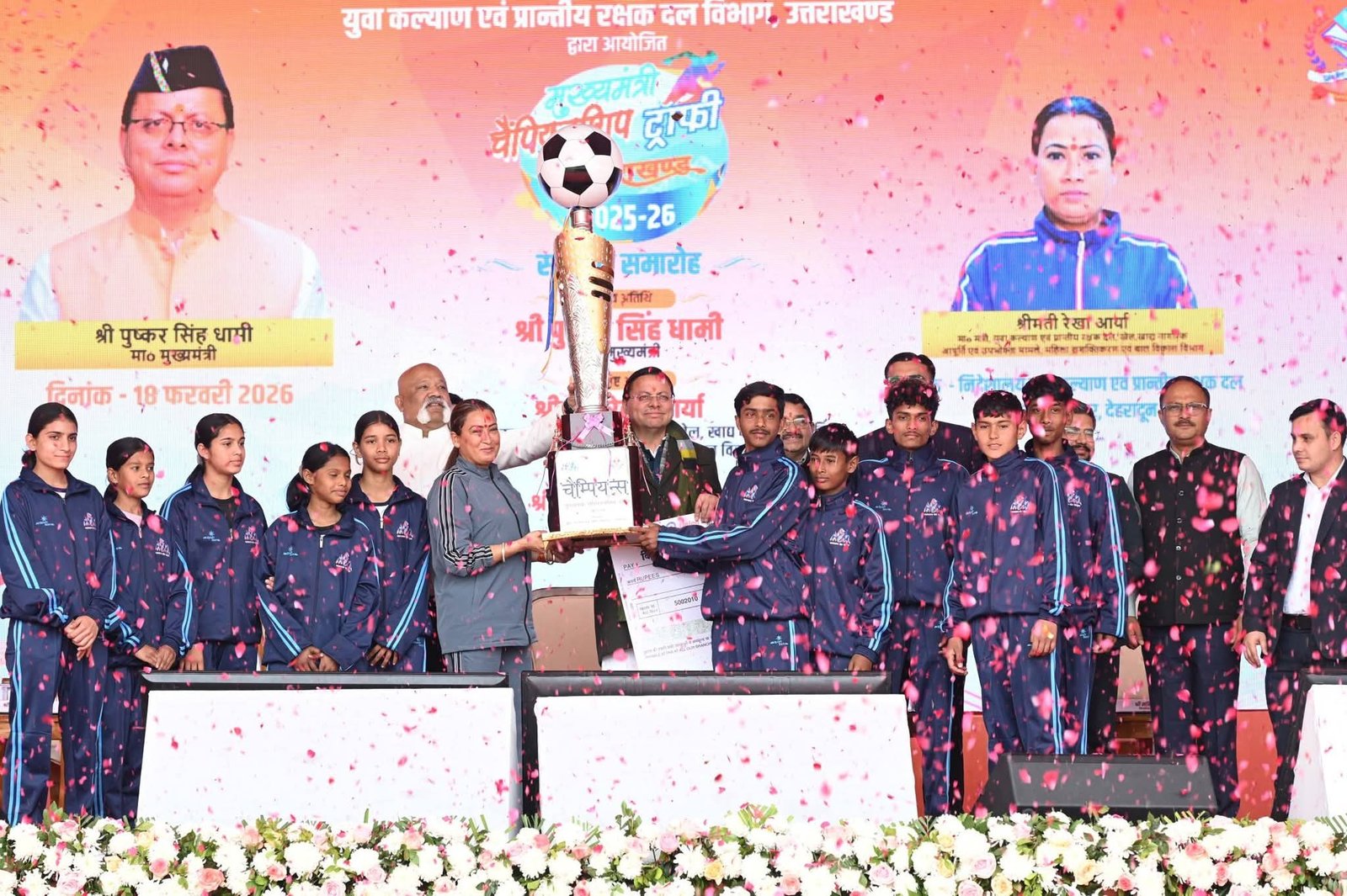 *देहरादून, 18 फरवरी। ननूरखेड़ा मिनी स्टेडियम में मुख्यमंत्री चैंपियनशिप ट्रॉफी 2025-26 के राज्य स्तरीय मुकाबले में देहरादून जनपद की टीम विजेता बनी। विजेता टीम को प्रदेश के मुख्यमंत्री पुष्कर सिंह धामी और कैबिनेट मंत्री रेखा आर्या ने ट्रॉफी एवं 5 लाख रुपये का चेक देकर सम्मानित किया।