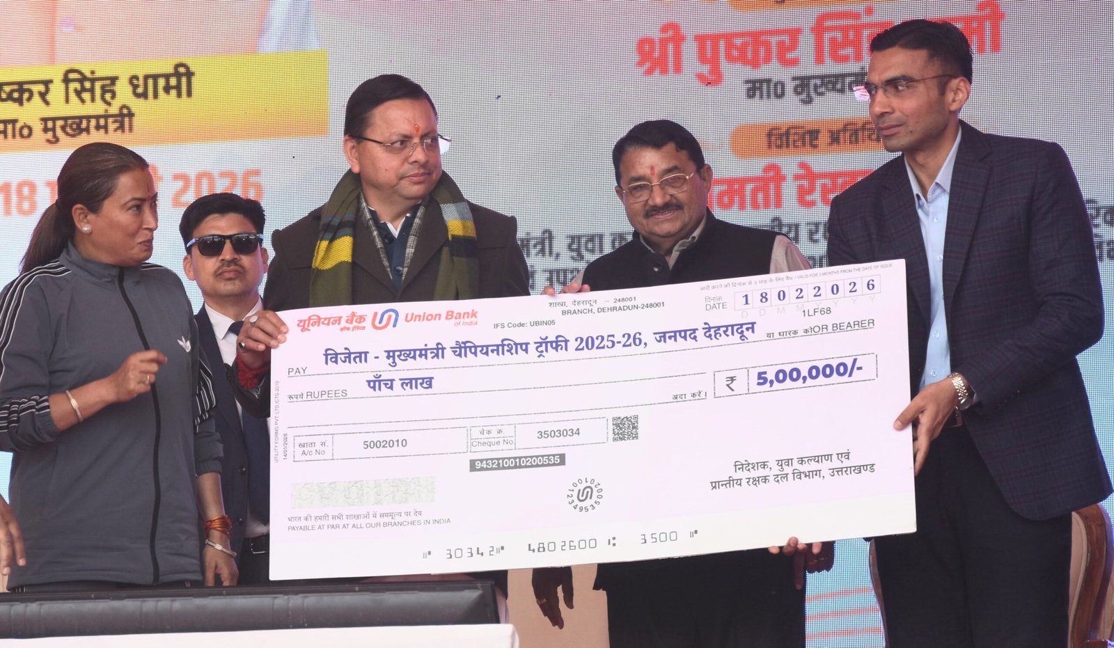 सीएम धामी ने मुख्यमंत्री चैंपियनशिप ट्रॉफी जीतने वाली टीम को 5 लाख का चेक देकर किया सम्मानित