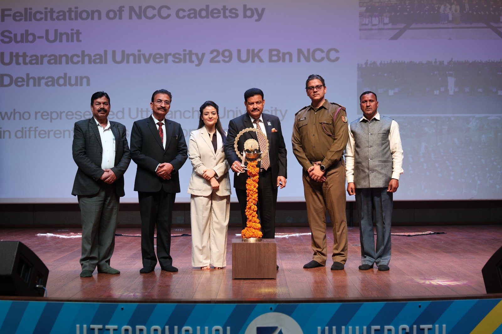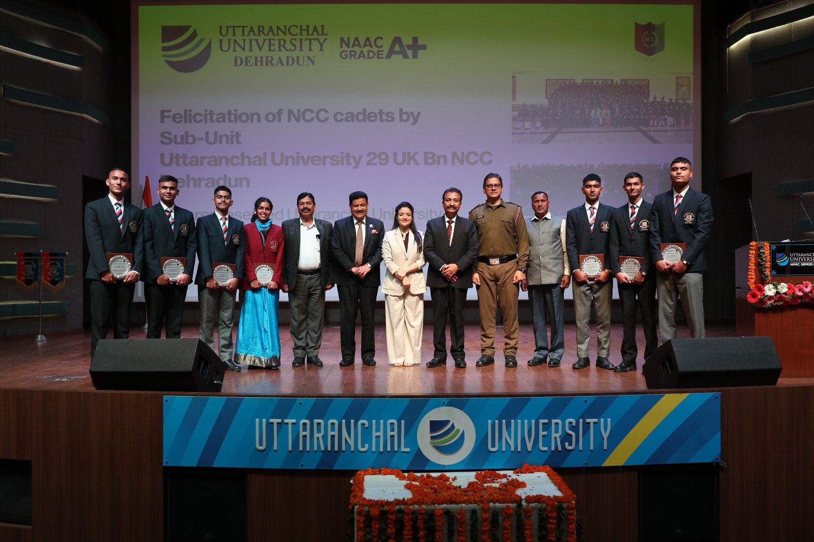 अपने सम्बोधन में विश्वविद्यालय की उपाध्यक्षा सुश्री अंकिता जोशी ने कहा कि उत्तरांचल विश्वविद्यालय की एन0सी0सी बटालियन ने एक अल्पकाल में राष्ट्रीय स्तरीय उपलब्धियाँ प्राप्त कर एक कीर्तिमान बनाया है। विशेषकर कैडेट आयुष गौड़ ने एफकेट में प्रथम स्थान पाकर भारतीय वायुसेना में फ्लायिंग आॅफिसर के रूप में सफलता पायी जबकि कैडेट आयुष भट्ट का चयन अंतर्राष्ट्रीय विश्वविद्यालय एलपाईन स्कींग प्रतिस्पर्धा में भारत का प्रतिनिधित्व करने के लिए हुआ। उन्होंने उत्कृष्ट उपलब्धियाँ प्राप्त करने वाले कैडेटस को बधाई दी।